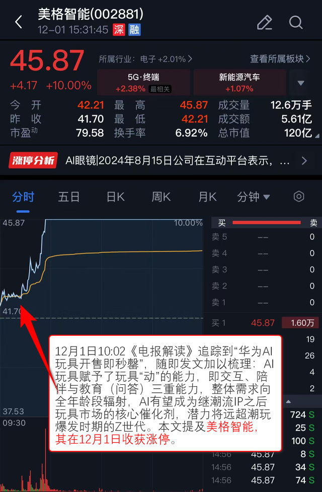 12月1日10:02《电报解读》 追踪到“华为AI玩具开售即秒罄”,随即发文加以梳理:AI玩具赋予了玩具“动”的能力,即交互、陪伴与教育(问答)三重能力,整体需求向全年龄段辐射,AI有望成为继潮流IP之后玩具市场的核心催化剂,潜力将远超潮玩爆发时期的Z世代。本文提及美格智能,其在12月1日收获涨停。
