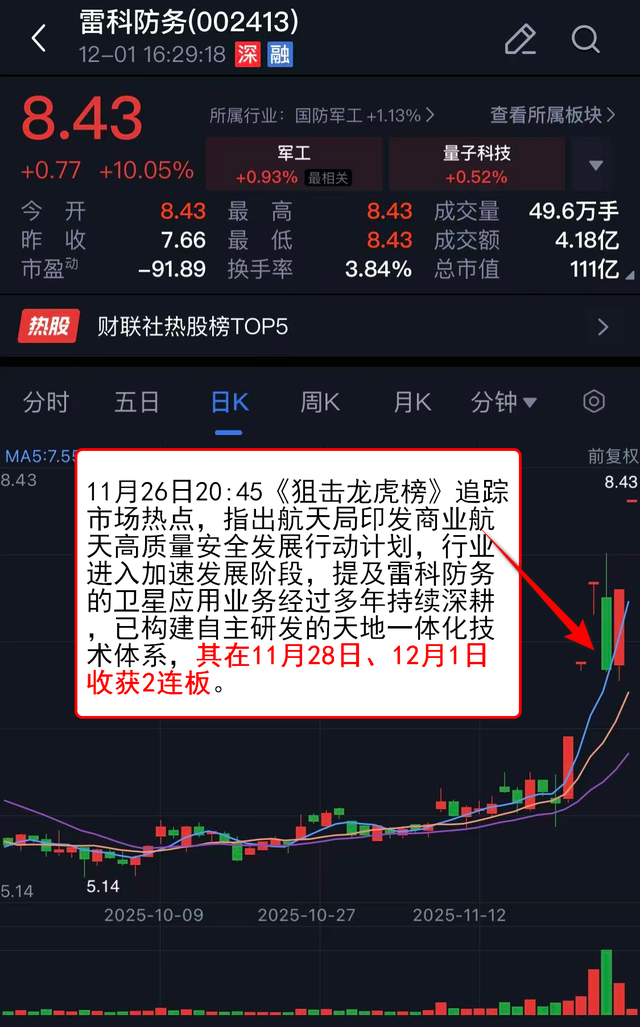 11月26日20:45《狙击龙虎榜》 追踪市场热点,指出航天局印发商业航天高质量安全发展行动计划,行业进入加速发展阶段,提及雷科防务的卫星应用业务经过多年持续深耕,已构建自主研发的天地一体化技术体系,其在11月28日、12月1日收获2连板。