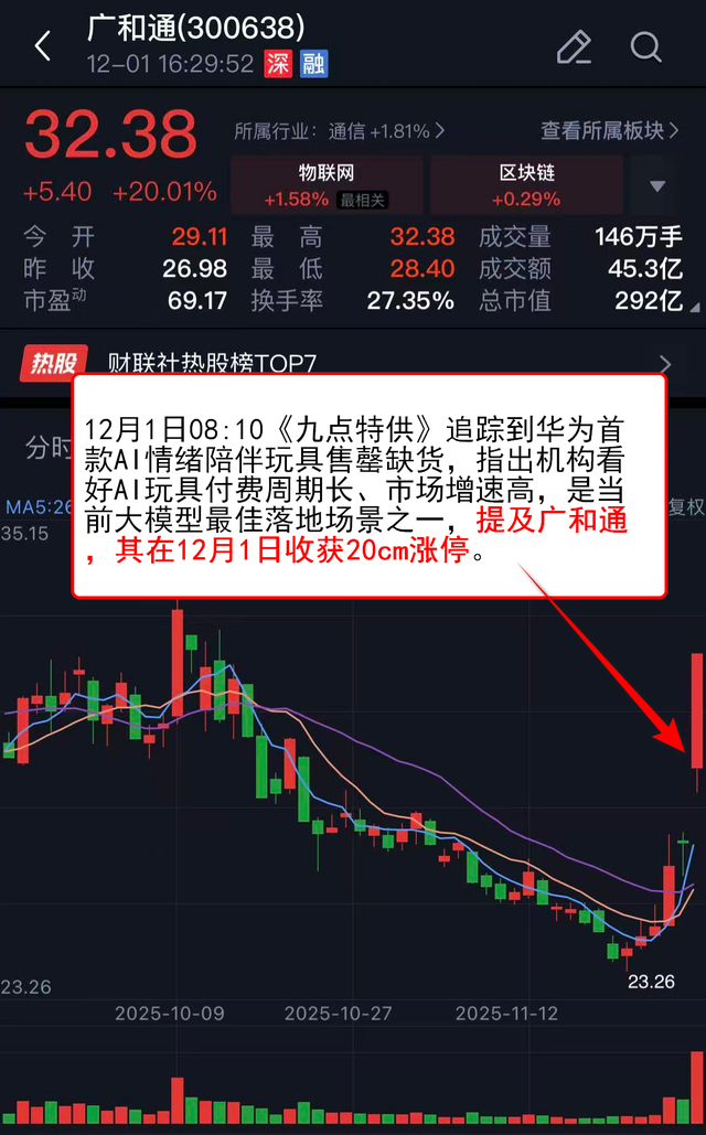 12月1日08:10《九点特供》 追踪到华为首款AI情绪陪伴玩具售罄缺货,指出机构看好AI玩具付费周期长、市场增速高,是当前大模型最佳落地场景之一,提及广和通,其在12月1日收获20cm涨停。