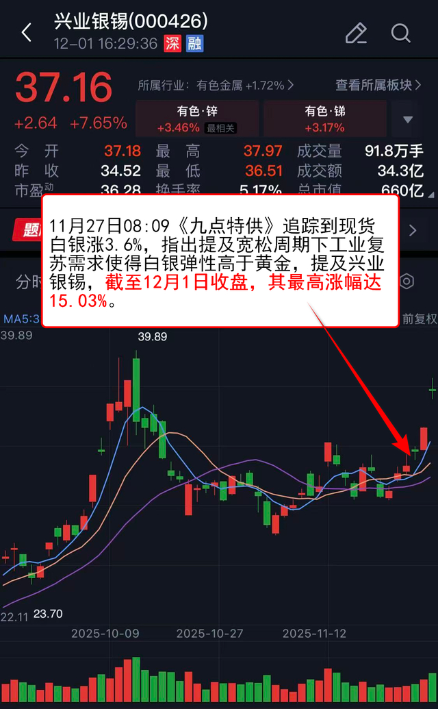 11月27日08:09《九点特供》 追踪到现货白银涨3.6%,指出提及宽松周期下工业复苏需求使得白银弹性高于黄金,提及兴业银锡,截至12月1日收盘,其最高涨幅达15.03%。