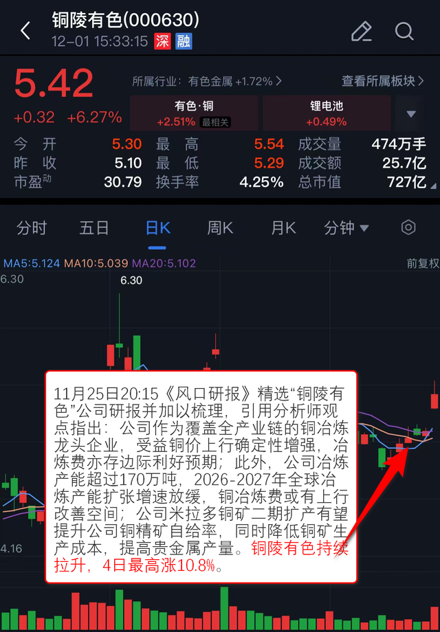 11月25日20:15《风口研报》 精选“铜陵有色”公司研报并加以梳理,引用分析师观点指出:公司作为覆盖全产业链的铜冶炼龙头企业,受益铜价上行确定性增强,冶炼费亦存边际利好预期;此外,公司冶炼产能超过170万吨,2026-2027年全球冶炼产能扩张增速放缓,铜冶炼费或有上行改善空间;公司米拉多铜矿二期扩产有望提升公司铜精矿自给率,同时降低铜矿生产成本,提高贵金属产量。铜陵有色持续拉升,4日最高涨10.8%。