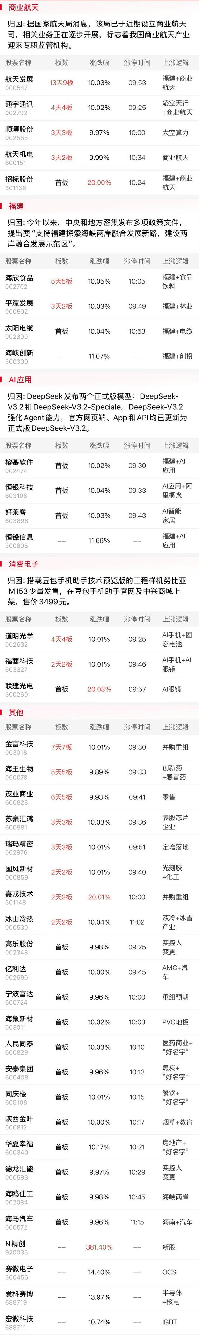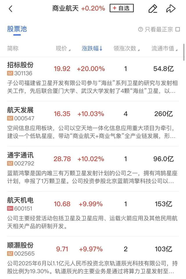 商业航天概念再度活跃,航天发展13天9板,通宇通讯4连板,招标股份、顺灏股份同样涨停,雷科防务、亚光科技、超捷股份等个股涨幅居前。