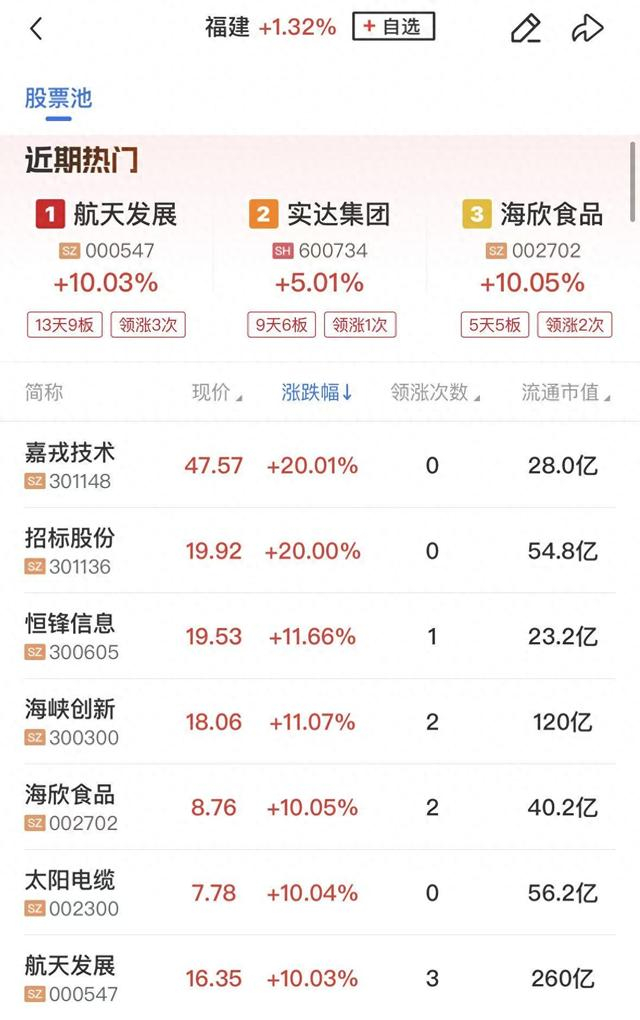 板块上,福建板块再度走强,嘉戎技术、招标股份、航天发展、平潭发展、榕基软件等个股涨停。
