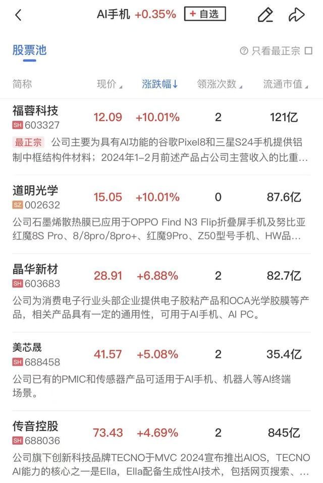 AI手机方向局部活跃,道明光学、福蓉科技涨停,朝阳科技、传音控股、新亚电子涨幅居前。