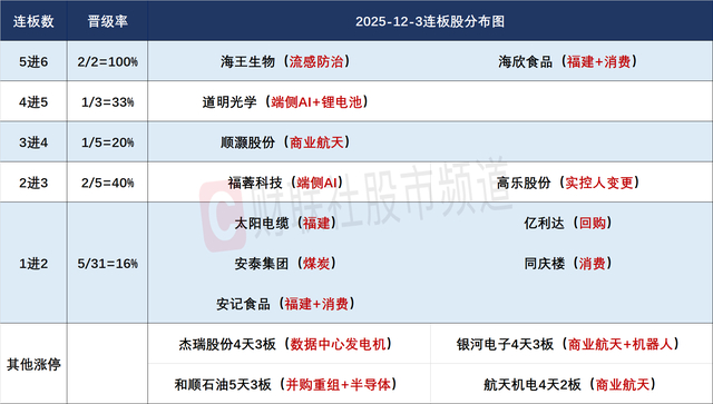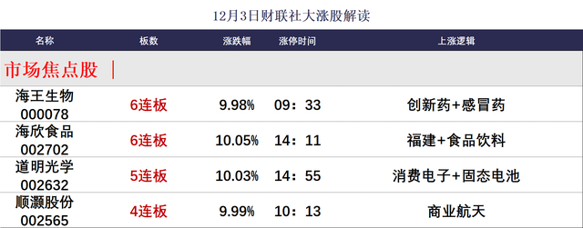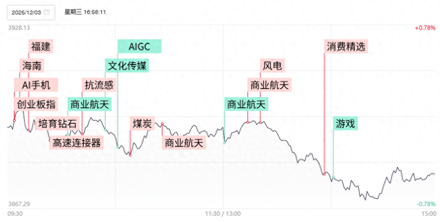 财联社12月3日讯,今日48股涨停,25股炸板,封板率为66%,海欣食品、海王生物6连板,道明光学5连板,顺灏股份4连板,福蓉科技、高乐股份3连板,银河电子、杰瑞股份4天3板,和顺石油5天3板。市场全天震荡调整,创业板指跌超1%,早盘一度涨超1%。沪深两市成交额1.67万亿,较上一个交易日放量765亿。全市场超3800只个股下跌。板块方面,培育钻石、煤炭、风电设备等板块涨幅居前,AI应用、锂矿等板块跌幅居前。截至收盘,沪指跌0.51%,深成指跌0.78%,创业板指跌1.12%。
