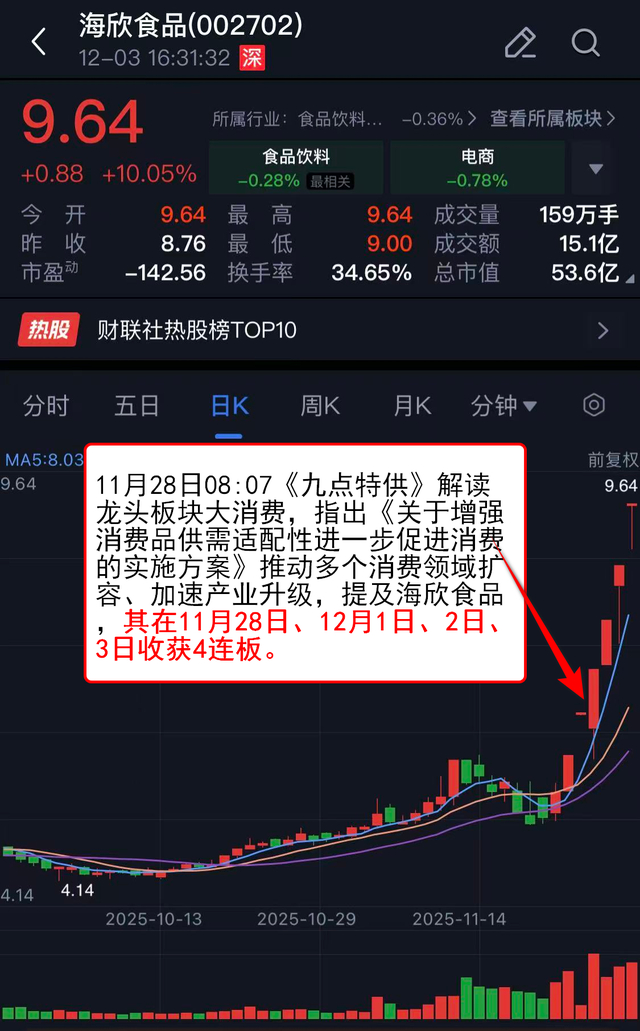 11月28日08:07《九点特供》 解读龙头板块大消费,指出《关于增强消费品供需适配性进一步促进消费的实施方案》推动多个消费领域扩容、加速产业升级,提及海欣食品,其在11月28日、12月1日、2日、3日收获4连板。