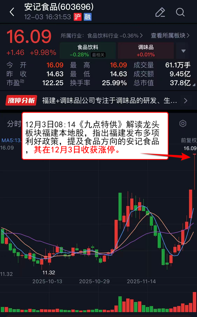 12月3日08:14《九点特供》 解读龙头板块福建本地股,指出福建发布多项利好政策,提及食品方向的安记食品,其在12月3日收获涨停。