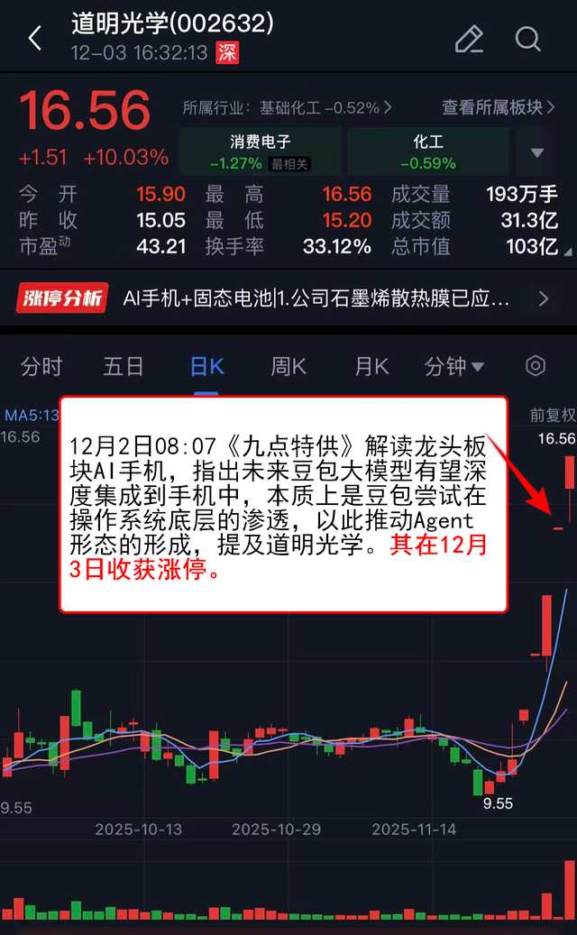12月2日08:07《九点特供》 解读龙头板块AI手机,指出未来豆包大模型有望深度集成到手机中,本质上是豆包尝试在操作系统底层的渗透,以此推动Agent形态的形成,提及道明光学。其在12月3日收获涨停。