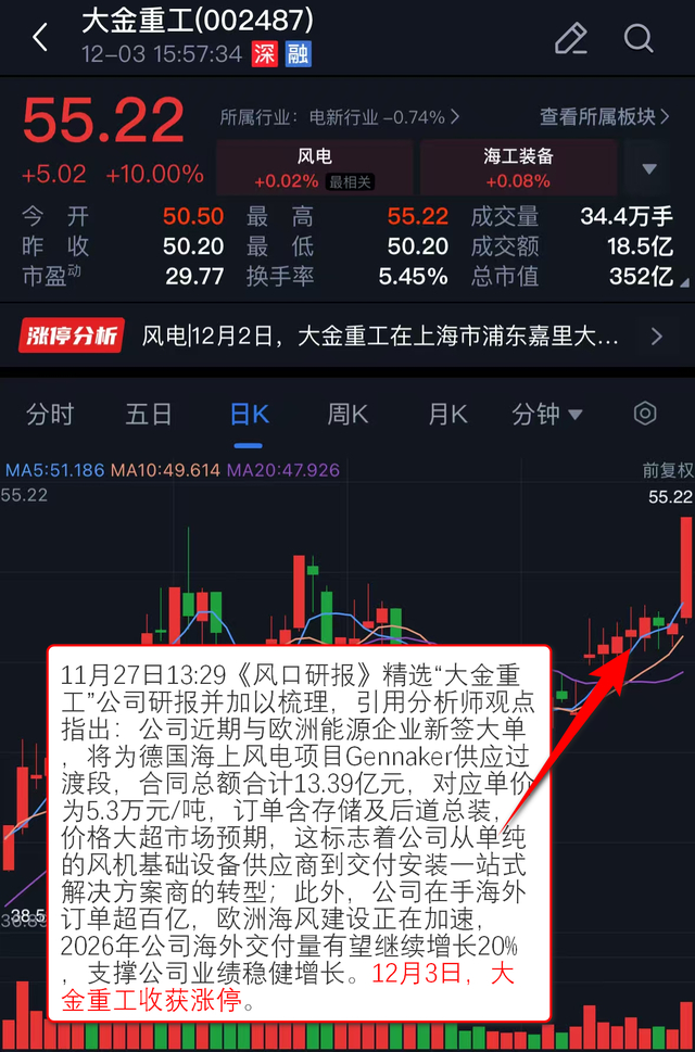11月27日13:29《风口研报》 精选“大金重工”公司研报并加以梳理,引用分析师观点指出:公司近期与欧洲能源企业新签大单,将为德国海上风电项目Gennaker供应过渡段,合同总额合计13.39亿元,对应单价为5.3万元/吨,订单含存储及后道总装,价格大超市场预期,这标志着公司从单纯的风机基础设备供应商到交付安装一站式解决方案商的转型;此外,公司在手海外订单超百亿,欧洲海风建设正在加速,2026年公司海外交付量有望继续增长20%,支撑公司业绩稳健增长。12月3日,大金重工收获涨停。