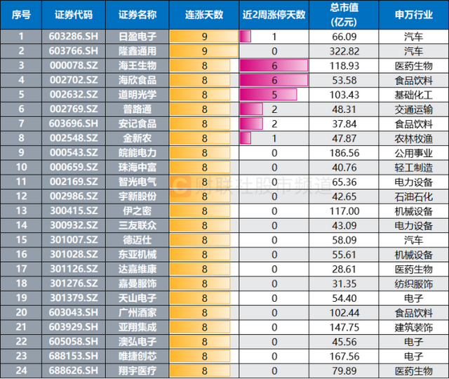 近期,市场热点快速轮动,不少个股迎来连续上涨行情。截至今日收盘,共有39只个股目前股价6连涨及以上。其中,日盈电子、隆鑫通用2股唯二录得9连涨,海王生物、皖能电力、珠海中富、智光电气、金新农、道明光学、海欣食品等共22股则获8连涨。在这些个股中,海王生物、海欣食品、*ST亚太、道明光学4股近2周的涨停次数相对较多。