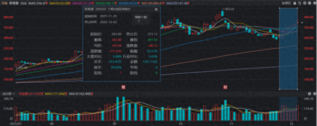 作为CPO板块核心热股,新易盛的市场关注度一直保持较高水平。从量能数据上看,其此次7连涨行情期间(11月25日至12月3日)日均成交额近174.53亿元,在整个A股市场中位居第二位,仅次于同为CPO龙头股的中际旭创(212.82亿元)。其中,新易盛今日全天成交额达221.02亿元,创10月30日以来近1个月新高。