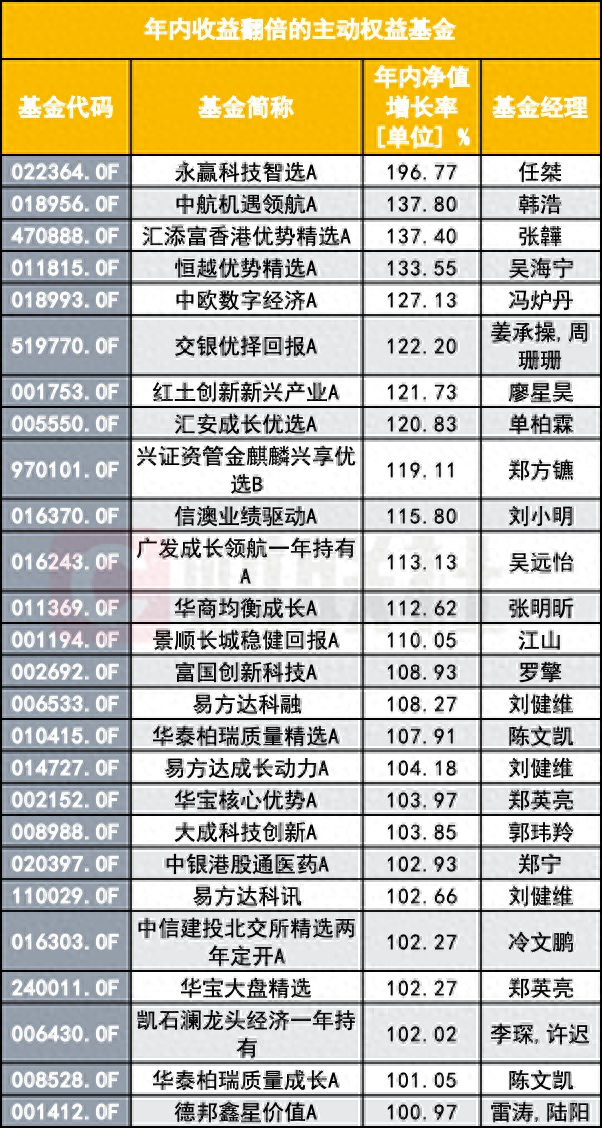 在这些翻倍基中,永赢科技智选以196.77%的净值增长率稳居榜首,收益率远超第二名中航机遇领航的137.80%,差距达58.97个百分点。紧随其后的是汇添富香港优势精选(137.40%)、恒越优势精选(133.55%)、中欧数字经济(127.13%)等产品,均聚焦于科技成长、出海机会、产业政策等主题赛道。