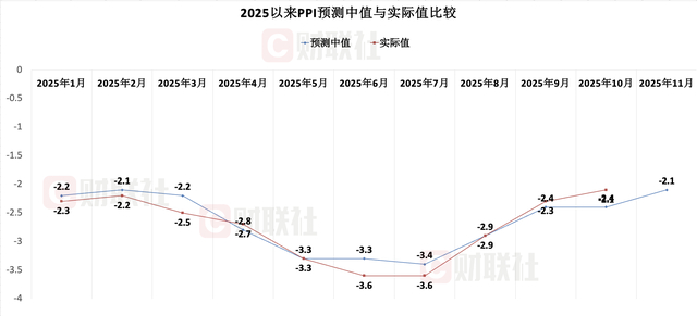 PPI方面,受部分行业供需关系改善、国际大宗商品价格传导等因素影响,10月PPI同比降幅收窄0.2个百分点至2.1%,为2024年9月来新高。从同比读数来看,市场机构对11月PPI的预测中值为-2.0%,预测区间为-2.3%至-1.9%。