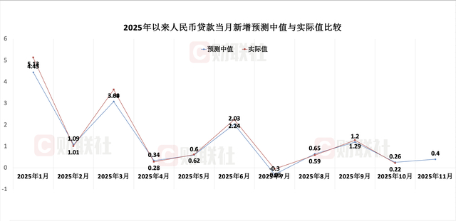 从本期来看,市场机构对11月新增新增人民币贷款的预测中值为0.4万亿元,较2024年同期0.58万亿元少增0.18万亿元,预测区间为0.29万亿至0.5万亿元。