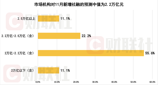 本期调查显示,市场机构对11月新增社融规模预测中值为2.2万亿元,较2024年同期2.33万亿元少增0.13万亿元,参与机构预测区间为1.6万亿至2.64万亿元。由于社融同比少增,六成市场机构预计11月末社融增速8.4%,环比下降0.1个百分点。