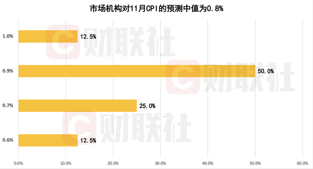 从同比读数来看,市场预计11月CPI同比增速或大幅回升,核心CPI涨幅或有回落。具体来看,市场机构对11月CPI的预测中值为0.8%,预测区间为0.6%至1%。