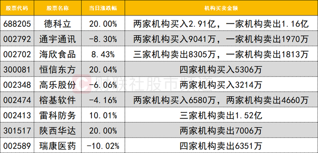 今日龙虎榜机构活跃度一般,买入方面,通宇通讯获两家机构买入9041万,同时遭一家机构卖出1970万。算力硬件概念股德科立今日20cm涨停,两家机构买入2.91亿,一家机构卖出1.16亿。
