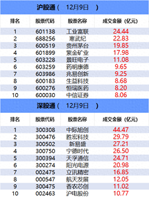 从沪股通前十大成交个股来看,工业富联位居首位;寒武纪和贵州茅台分居二、三位。