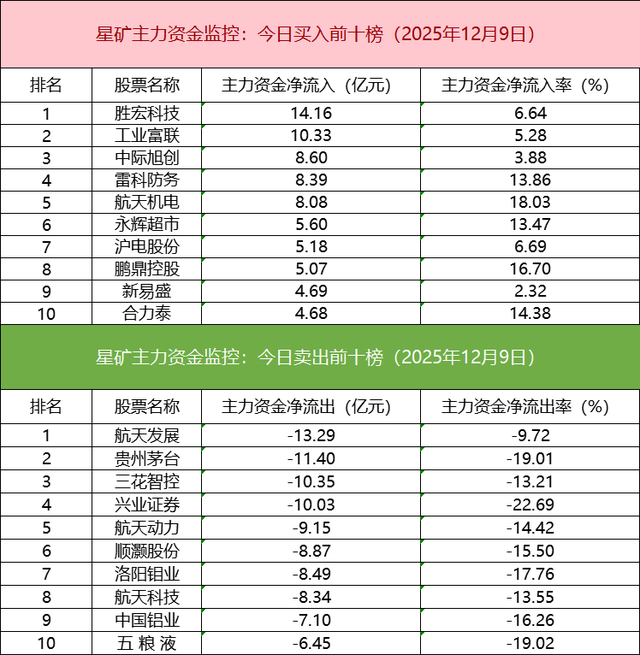 主力资金流出前十的个股所属板块较为分散,航天发展净流出居首。