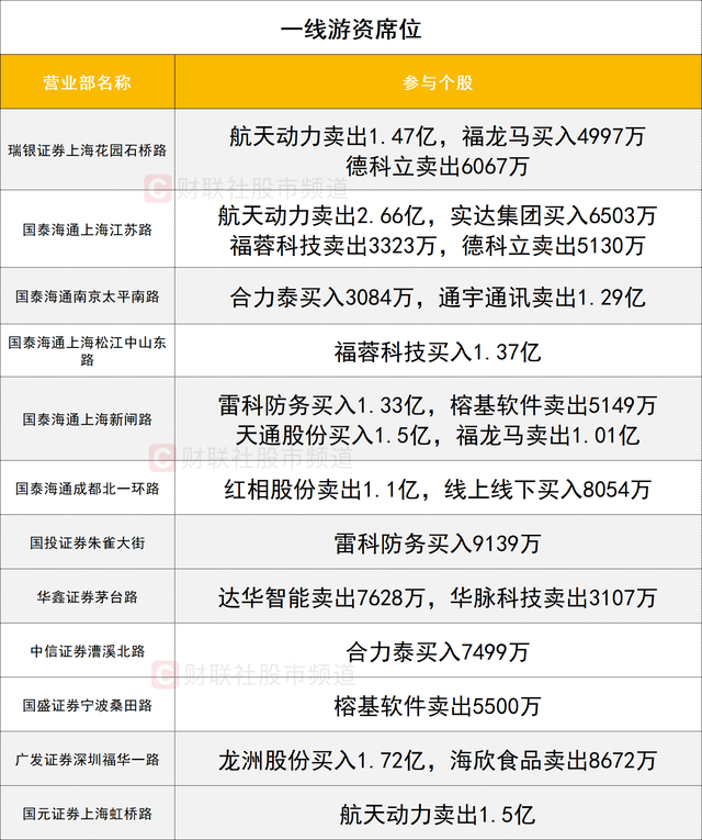 一线游资活跃度较高,多只福建本地股遭游资抛售,其中海欣食品遭一家一线游资席位(广发证券深圳福华一路)卖出8672万,榕基软件遭两家一线游资席位(国盛证券宁波桑田路、国泰海通证券上海新闸路)合计卖出1.06亿,红相股份遭一家一线游资席位(国泰海通证券成都北一环路)卖出1.1亿。