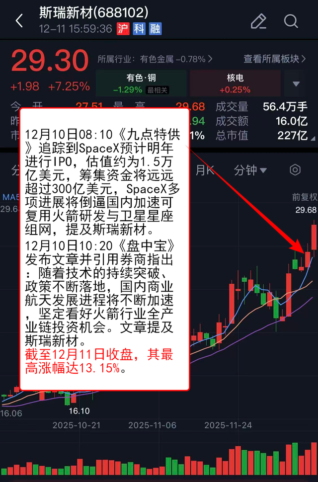 12月10日08:10《九点特供》 追踪到SpaceX预计明年进行IPO,估值约为1.5万亿美元,筹集资金将远远超过300亿美元,SpaceX多项进展将倒逼国内加速可复用火箭研发与卫星星座组网,提及斯瑞新材。