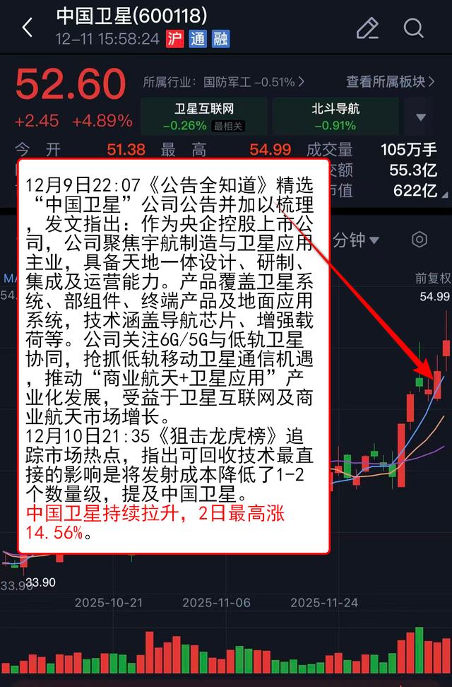 12月10日21:35《狙击龙虎榜》 追踪市场热点,指出可回收技术最直接的影响是将发射成本降低了1-2个数量级,提及中国卫星。