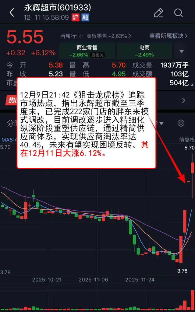 12月9日21:42《狙击龙虎榜》 追踪市场热点,指出永辉超市截至三季度末,已完成222家门店的胖东来模式调改,目前调改逐步进入精细化纵深阶段重塑供应链,通过精简供应商体系,实现供应商淘汰率达40.4%,未来有望实现困境反转。其在12月11日大涨6.12%。