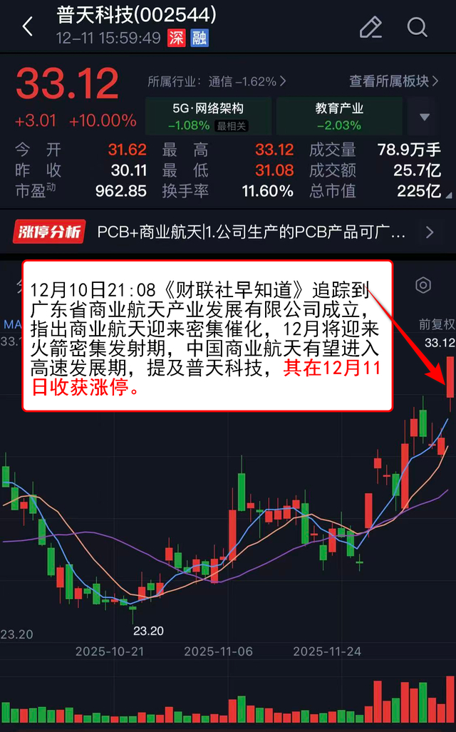 12月10日21:08《财联社早知道》 追踪到广东省商业航天产业发展有限公司成立,指出商业航天迎来密集催化,12月将迎来火箭密集发射期,中国商业航天有望进入高速发展期,提及普天科技,其在12月11日收获涨停。