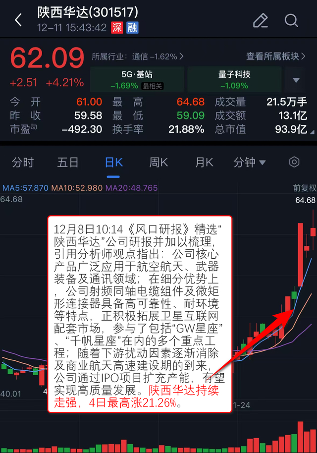 12月8日10:14《风口研报》 精选“陕西华达”公司研报并加以梳理,引用分析师观点指出:公司核心产品广泛应用于航空航天、武器装备及通讯领域;在细分优势上,公司射频同轴电缆组件及微矩形连接器具备高可靠性、耐环境等特点,正积极拓展卫星互联网配套市场,参与了包括“GW星座”、“千帆星座”在内的多个重点工程;随着下游扰动因素逐渐消除及商业航天高速建设期的到来,公司通过IPO项目扩充产能,有望实现高质量发展。陕西华达持续走强,4日最高涨21.26%。