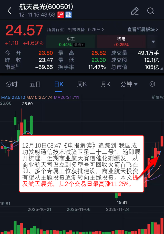 12月10日08:47《电报解读》 追踪到“我国成功发射通信技术试验卫星二十二号”,随即展开梳理:近期商业航天赛道催化剂频发,从商业航天司设立到多型号可回收火箭首飞在即、多个专属工位获批建设,商业航天投资有望从主题投资逐渐转向主线投资。本文提及航天晨光,其2个交易日最高涨11.25%。