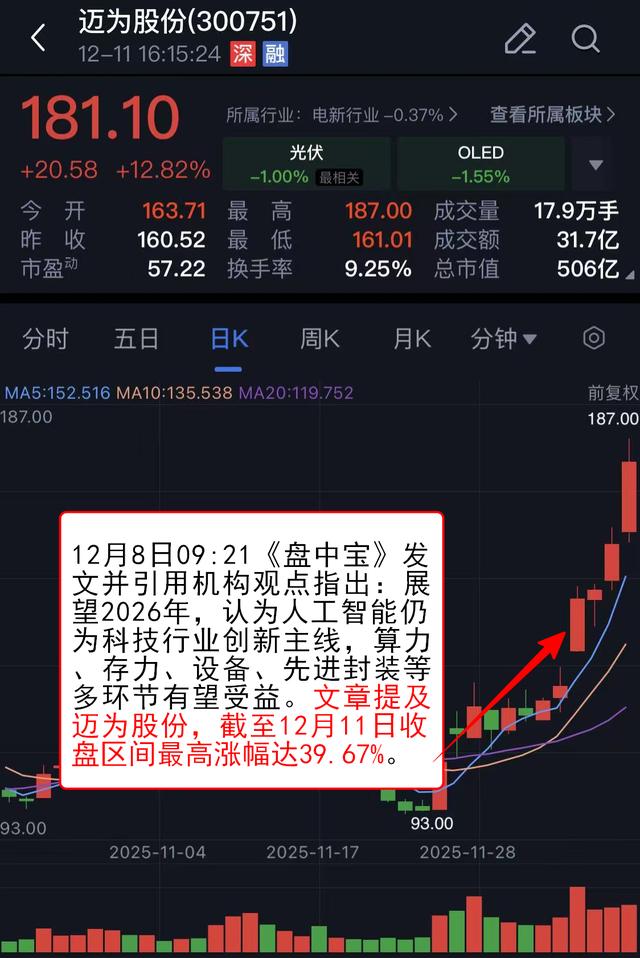 12月8日09:21《盘中宝》 发文并引用机构观点指出:展望2026年,认为人工智能仍为科技行业创新主线,算力、存力、设备、先进封装等多环节有望受益。文章提及迈为股份,截至12月11日收盘区间最高涨幅达39.67%。