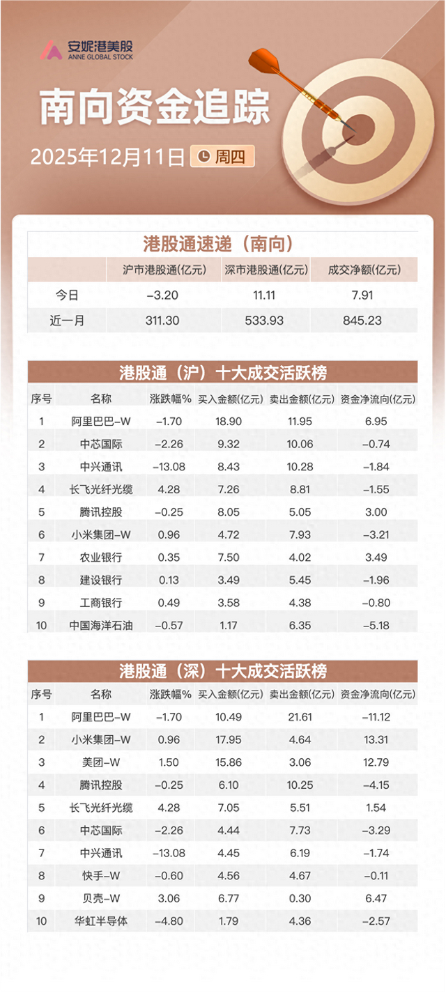 港股今日高开低走震荡整理,南向资金全天仅净买入约7.91亿港元。其中,沪港股通净流出约3.20亿港元,深港股通净流入约11.11亿港元。