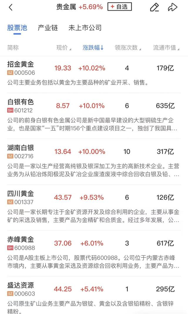 贵金属持续走强,湖南白银、招金黄金双双涨停,四川黄金、赤峰黄金、盛达资源等个股涨幅居前。