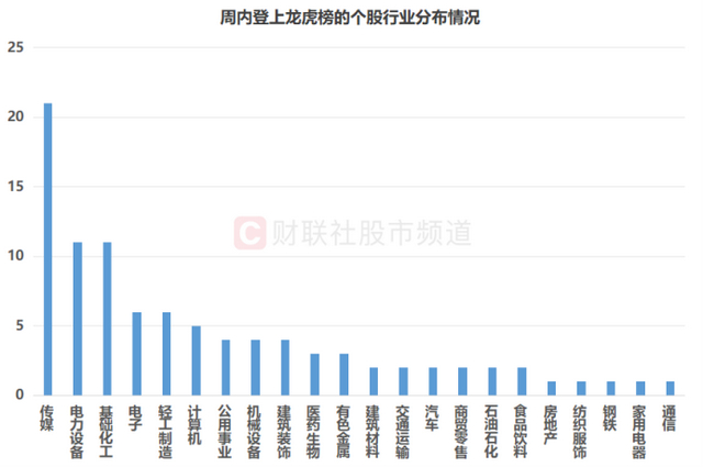 按行业层面(申万一级)统计,截至2月10日数据,剔除ST股,周内登上龙虎榜的95只个股中,传媒、电力设备、基础化工三大板块的个股数量明显较多,其分别占比22.1%、11.6%、11.6%,同时,电子、轻工制造、计算机、公用事业、机械设备、建筑装饰、医药生物、有色金属股数量也相对较多,占比均在3%以上。