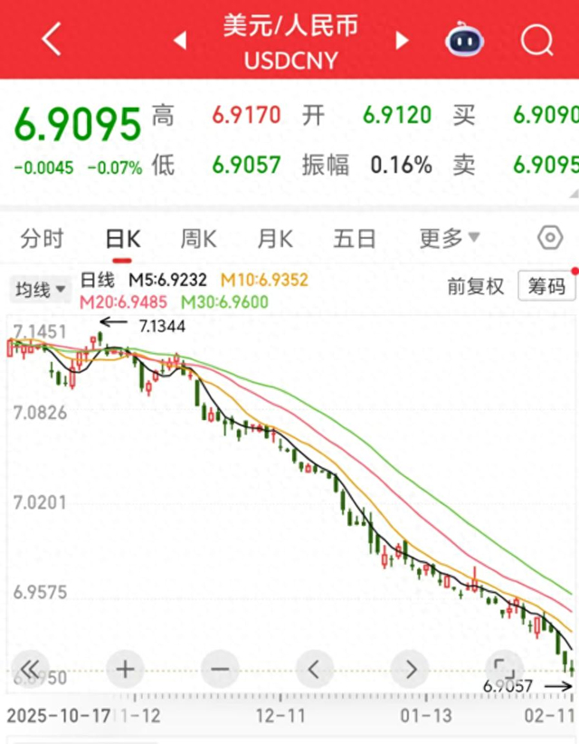 2025年4月9日成为本轮行情重要拐点,当日离岸人民币兑美元大涨1.1%,此后开启一轮趋势性升值。截至2026年2月11日,近一年来,累计升值幅度已达6.99%。