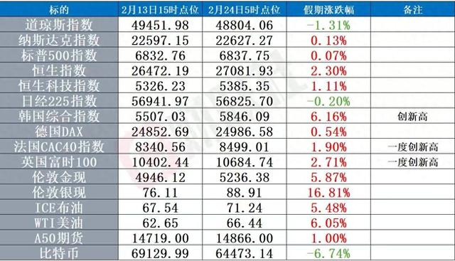 1、马年春节假期全球资本市场多数上涨,韩国、英国、法国等多国指数均创历史新高。特朗普关税进入迷雾区,美伊冲突走向愈加悲观,国际金银、油价大涨,白银涨近17%。