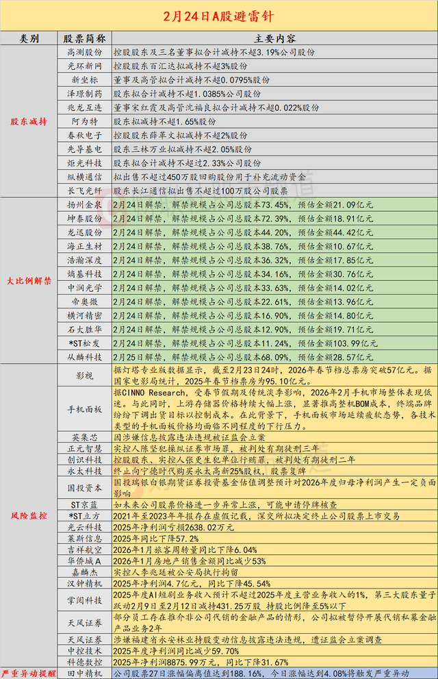 导读:财联社2月24日投资避雷针,近日,A股及海外市场潜在风险事件如下。国内经济信息方面包括:1)财通证券指出,春节后首周流动性缺口显著扩张;2)2026年春节档总票房突破57亿元,2025年春节档票房为95.10亿元;公司方面重点关注包括:1)正元智慧实控人陈坚犯操纵证券市场罪,被判处有期徒刑三年;2)创识科技控股股东、实控人张更生犯单位行贿罪,被判处有期徒刑二年;海外市场重点关注包括:1)美股三大指数收盘均跌超1%,IBM创2000年以来最大跌幅;2)美联储理事沃勒表示,若2月就业数据强劲,可能倾向于暂停降息。