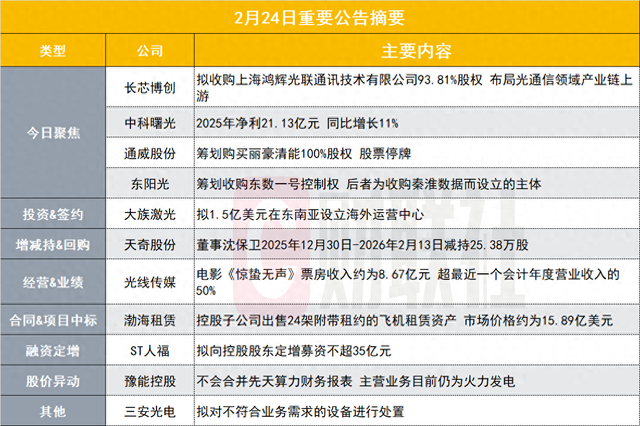 长芯博创(300548.SZ)公告称,公司于2026年2月24日与上海鸿辉光通科技股份有限公司签订股权收购意向书,拟收购其持有的上海鸿辉光联通讯技术有限公司93.8108%的股权。目标股权转让的暂定意向价格为人民币3.75亿元,交易金额、交易方案等将根据尽职调查结果、审计及评估结果等进一步协商谈判确定。标的公司主营业务包括光通信设备销售等。本次收购是公司在光通信领域产业链上游的布局,公司拟通过本次收购实现公司产品在光学器件上游领域的拓展,提升公司盈利能力和持续经营能力,并进一步发挥协同效应。