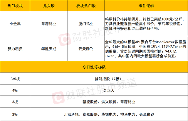 算力租赁方向同样于盘中活跃,云天励飞、利通电子、拓维信息、杭钢股份、金开新能等个股涨停,首都在线、宏景科技、协创数据等个股涨幅居前。