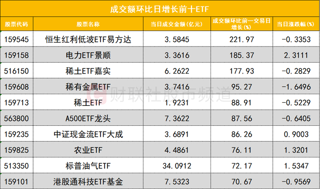 从成交额环比增长前十的ETF来看,恒生红利低波ETF易方达(159545)成交额环比增长221%位居首位;电力ETF景顺(159158)成交额环比增长185%位居次席。
