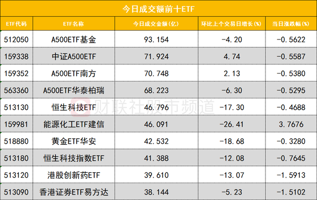从成交额前十的ETF来看,A500ETF基金(512050)成交额位居首位,中证A500ETF(159338)成交额位居次席。