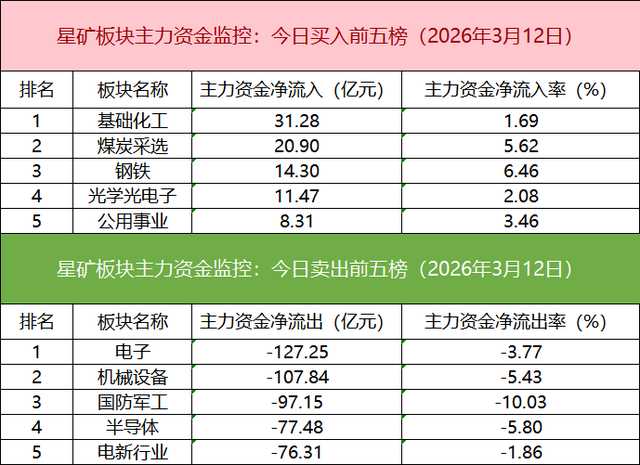 板块资金流出方面,电子板块主力资金净流出居首。