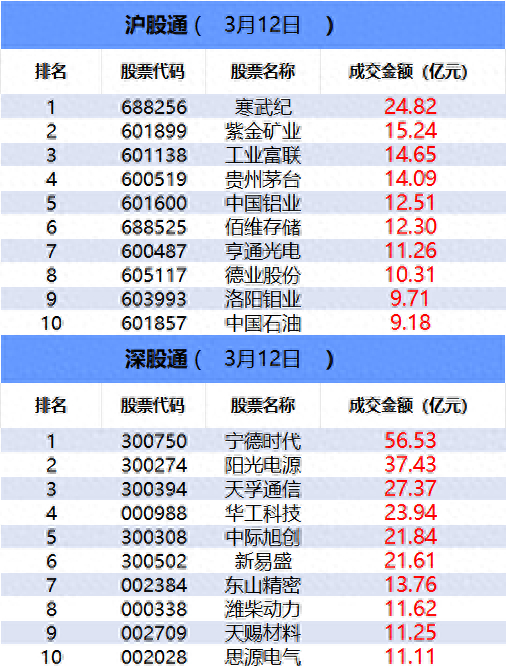 从沪股通前十大成交个股来看,寒武纪位居首位;紫金矿业和工业富联分居二、三位。