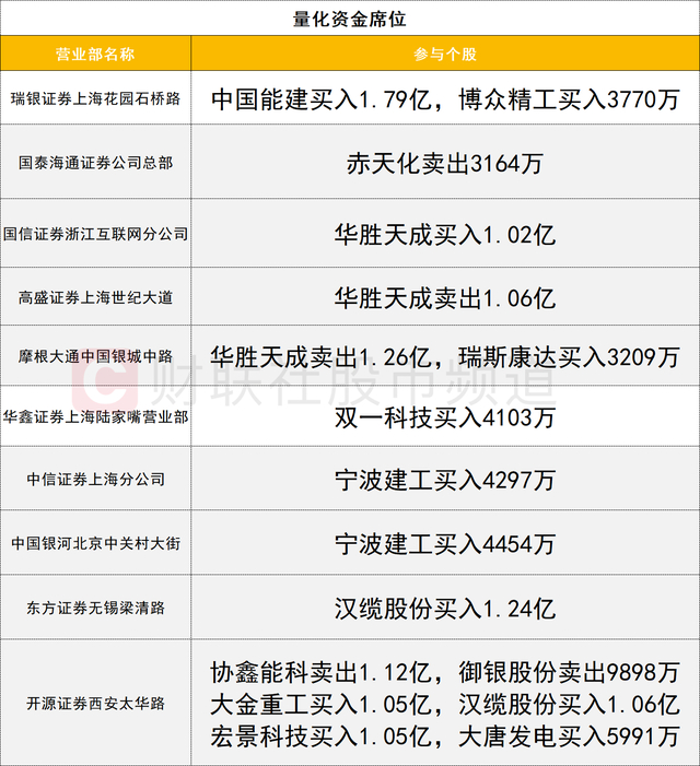 量化资金活跃度较高,汉缆股份获两家量化资金(东方证券无锡梁清路、开源证券西安太华路)合计买入2.3亿。宏景科技获一家量化资金(开源证券西安太华路)买入1.05亿。