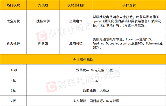 太空光伏概念涨幅居前,首航新能、正泰电源、国晟科技涨停,海优新材、昱能科技、禾迈股份、捷佳伟创、迈为股份、拉普拉斯等个股涨幅居前。