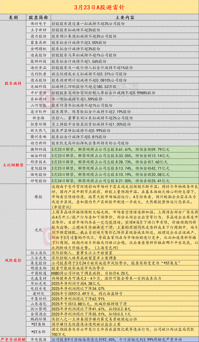 导读:财联社3月23日投资避雷针,近日A股及海外市场潜在风险事件如下。国内经济信息方面包括:1)多家品牌金饰价格跌破1400元/克,一周下降超百元;2)上周多晶硅价格继续大幅走跌,预计后续4-5月下游订单有限;公司方面重点关注包括:1)恒立液压实际控制人、董事长汪立平被留置;2)三安光电实际控制人林秀成被留置并立案调查;海外市场重点关注包括:1)上周五美股三大指数集体收跌,纳指跌超2%,光通信概念股跌幅居前;2)国际能源署署长警告称,恢复海湾地区的石油和天然气输送可能需要六个月时间。