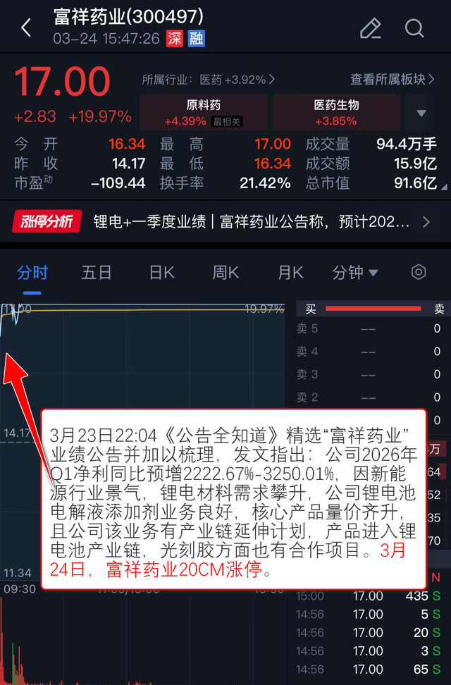 3月23日22:04《公告全知道》 精选“富祥药业”业绩公告并加以梳理,发文指出:公司2026年Q1净利同比预增2222.67%-3250.01%,因新能源行业景气,锂电材料需求攀升,公司锂电池电解液添加剂业务良好,核心产品量价齐升,且公司该业务有产业链延伸计划,产品进入锂电池产业链,光刻胶方面也有合作项目。3月24日,富祥药业20CM涨停。