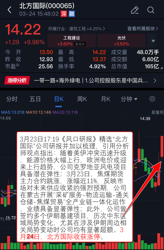 3月23日17:19《风口研报》 精选“北方国际”公司研报并加以梳理,引用分析师观点指出:随着美伊冲突迅速升级,能源价格大幅上行,欧洲电价或迎来上行趋势,公司克罗地亚风电项目具备潜在弹性;3月23日,焦煤期货主力合约跳涨,涨幅近11%,反映市场对未来供应收紧的强烈预期,公司在蒙古开展'采矿服务-物流运输-通关仓储-焦煤贸易'全产业链一体化运作,业绩具备显著弹性;此外,公司曾签约多个伊朗基建项目,历次中东区域局势变化,尤其在涉及伊朗周边相关局势变动时公司均有显著超额。3月24日,北方国际收获涨停。
