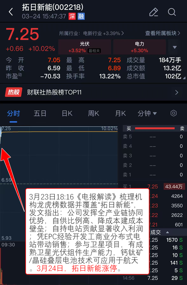 3月23日18:16《电报解读》 梳理机构龙虎榜数据并覆盖“拓日新能”,发文指出:公司发挥全产业链协同优势,自供比例高、降成本建成本壁垒;自持电站贡献显著收入利润;凭EPC经验开发工商业分布式电站带动销售;参与卫星项目,有成熟卫星光伏组件生产能力,钙钛矿/晶硅叠层电池技术可应用于航天。3月24日,拓日新能涨停。
