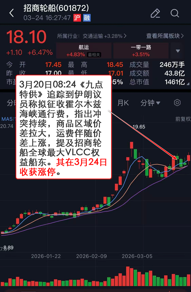 3月20日08:24《九点特供》 追踪到伊朗议员称拟征收霍尔木兹海峡通行费,指出冲突持续,商品区域价差拉大,运费伴随价差上涨,提及招商轮船全球最大VLCC权益船东。其在3月24日收获涨停。